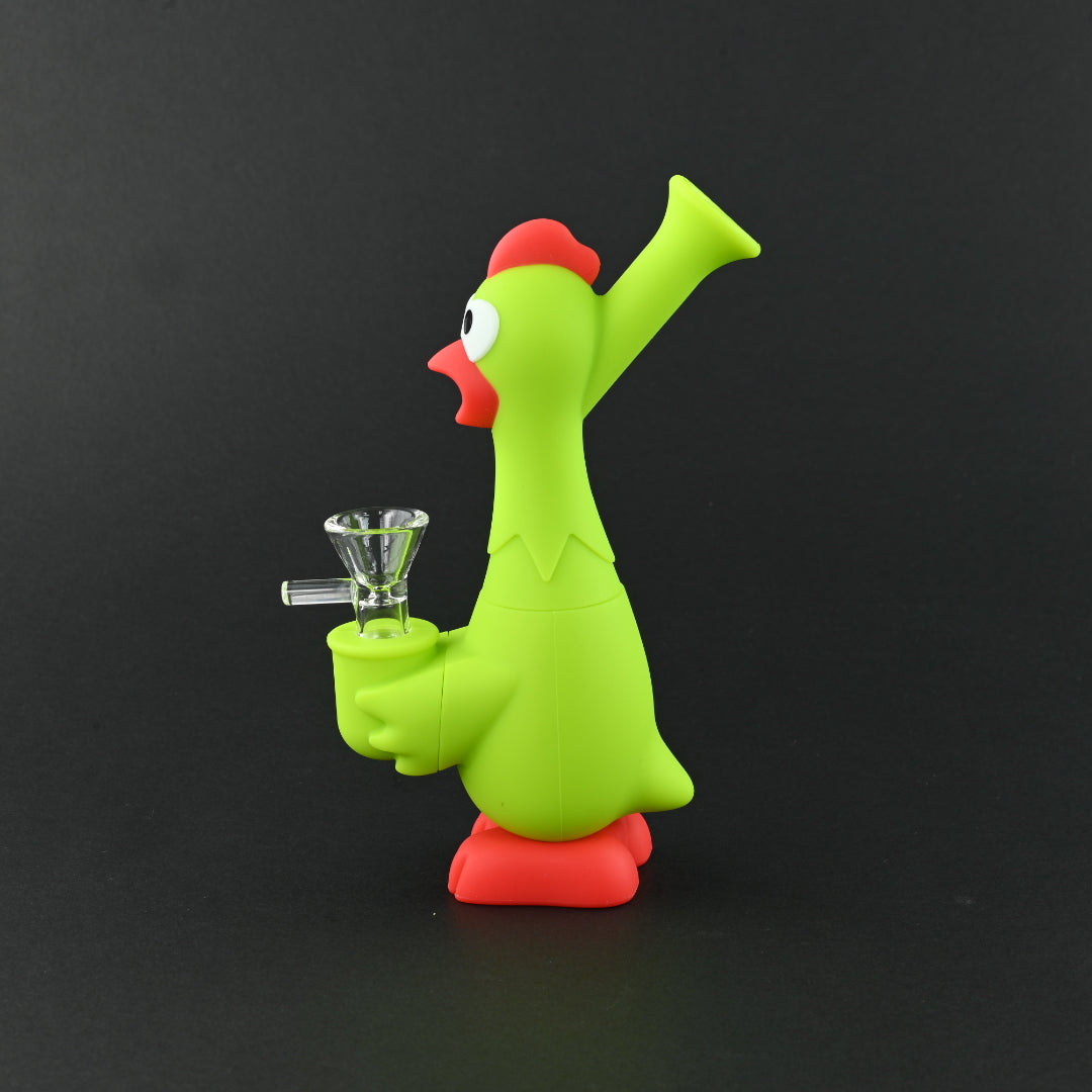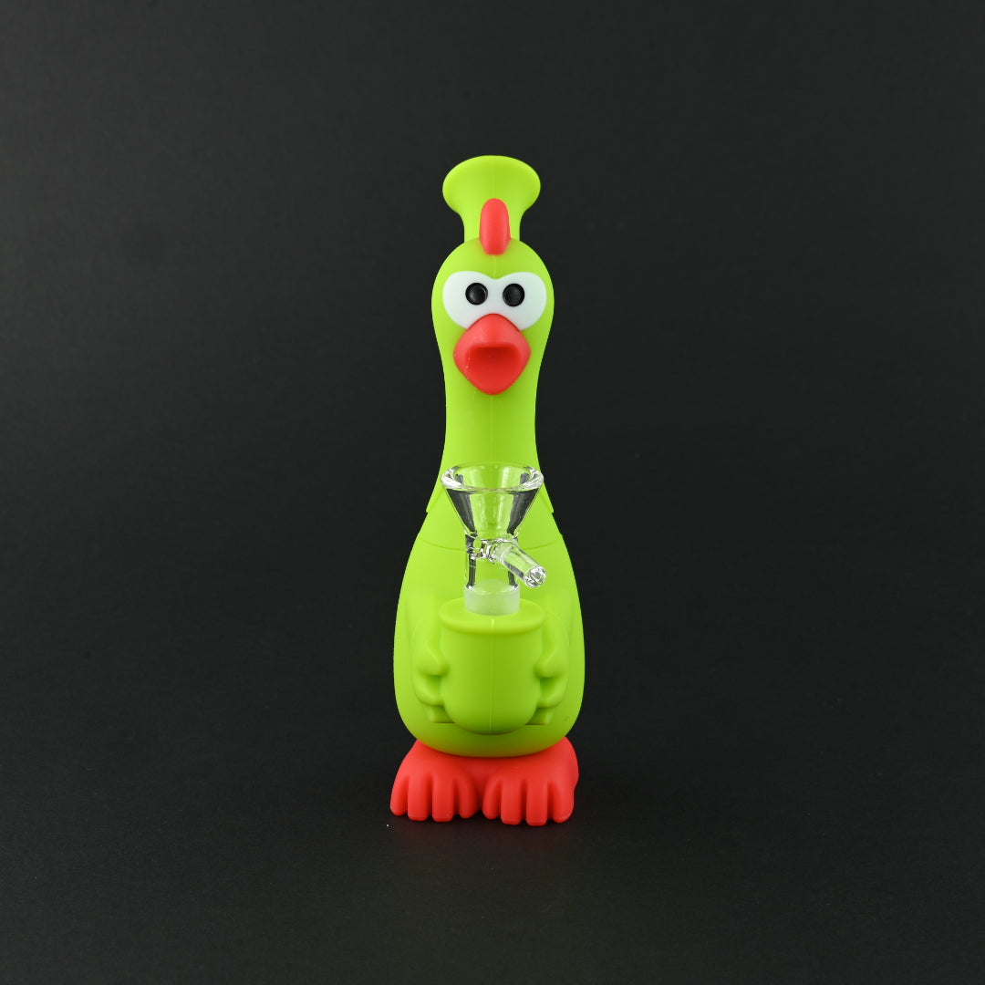 This product is a whimsical silicone bong designed to look like a green chicken. Its playful design adds a fun touch to your smoking sessions. Made from durable silicone, it is flexible and resistant to damage. The glass bowl and downstem ensure a smooth smoking experience. Many parts are removable for easy cleaning and maintenance. Compact and lightweight, this green chicken bong is perfect for both beginners and seasoned users who appreciate functionality and charm in their smoking accessories.
