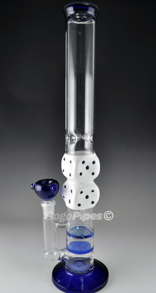 Welcome to the exciting world of Glass Dice Water Pipes! These dynamic water pipes stand tall at almost 19 inches and feature not one, but two powerful percolators - a turbine and a frite - sitting atop a sturdy and weighty base. The wide two inch mouth and solid ice pinch add to the intense experience. Are you ready to roll the dice and break through to a new level of smoking?