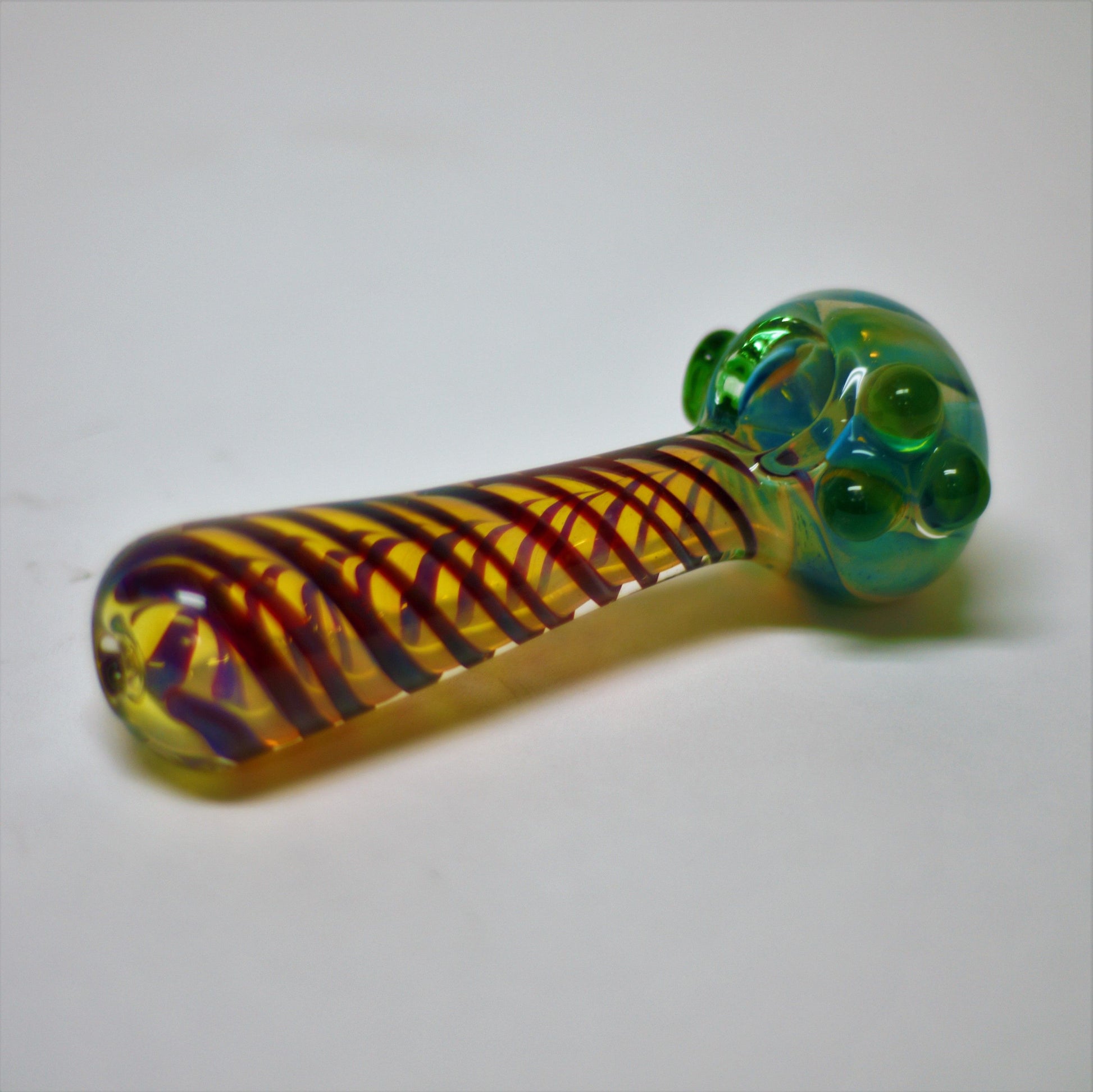 The Red ribbon wraps around the pipe in thick, immortal glass. There are more colors to this design like blue ribbons with or without yellow tint, and blue ribbons with red bowl tint. This piece is also about 4 inches long and has three green glass beads.