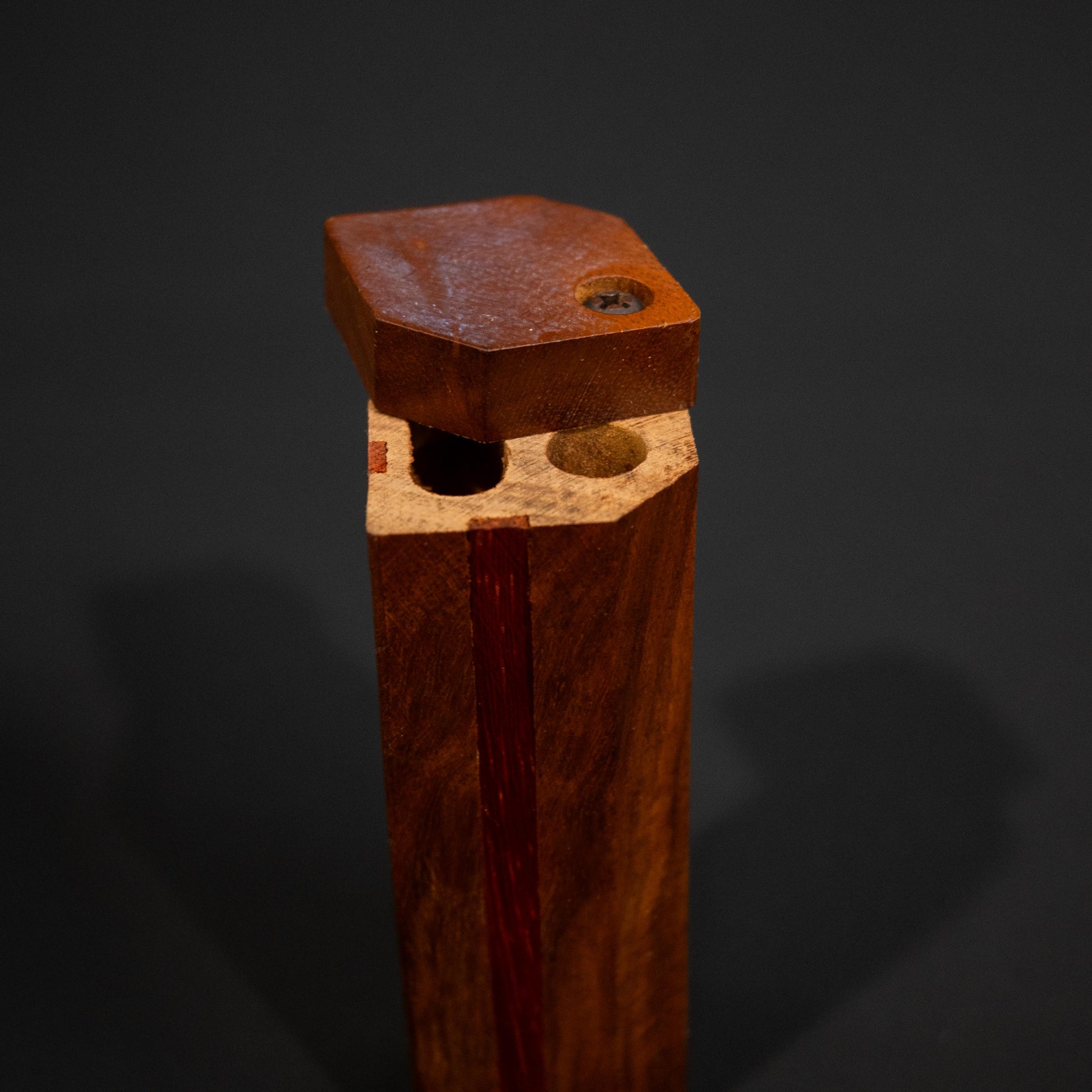 This tall wood dugout is made for smokers who like extra storage in a slim pocket piece. The long body gives you more room for dry herb while keeping a compact square footprint that fits easily in a pocket or bag. A rich wood finish with a center stripe adds a simple classic look. The swivel lid opens to reveal a herb chamber and a slot that fits most standard cigarette style one hitter pipes. A great everyday dugout for travel or discreet home use. One hitter pipe not included.
