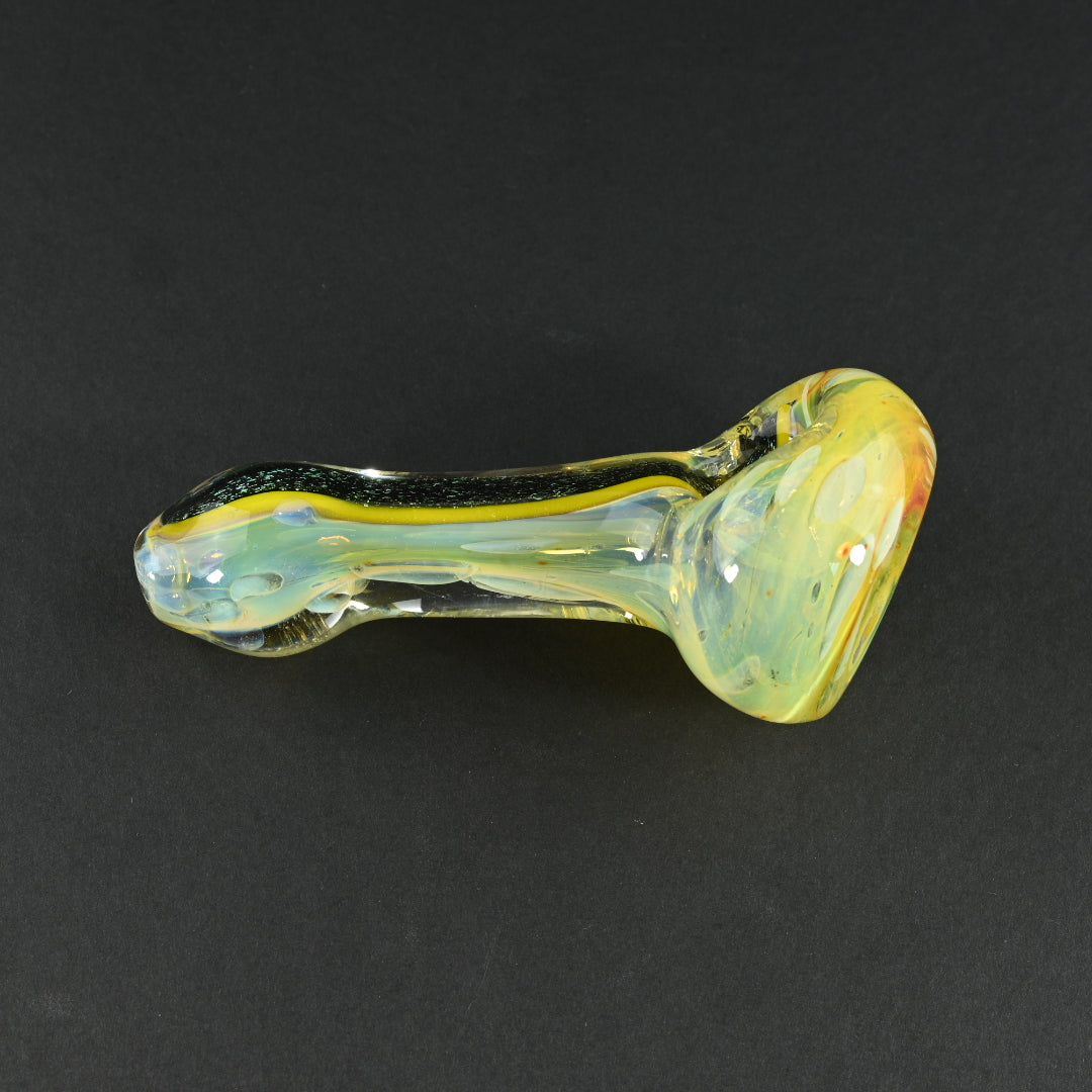 GogoPipes introducing the yellow mellow glass pipe. It is about 4 inches long. It has beautiful colors in it.